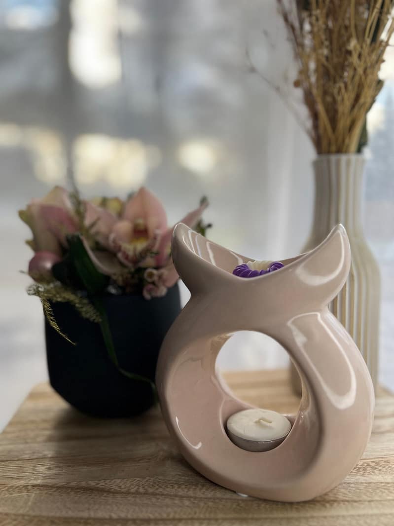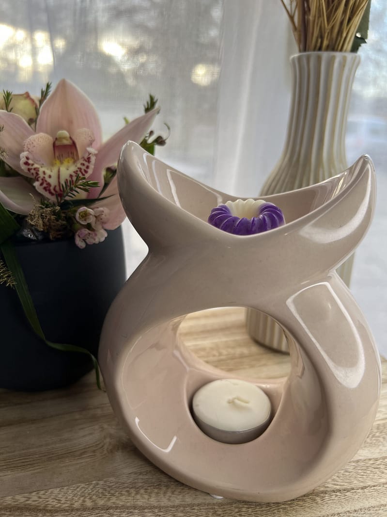 Pour commencer, se munir d’un Brûleur (Brûle Parfum, Diffuseur de Parfum), d’un fondant de la senteur qui vous plaira et d’une bougie chauffe-plat non parfumée.