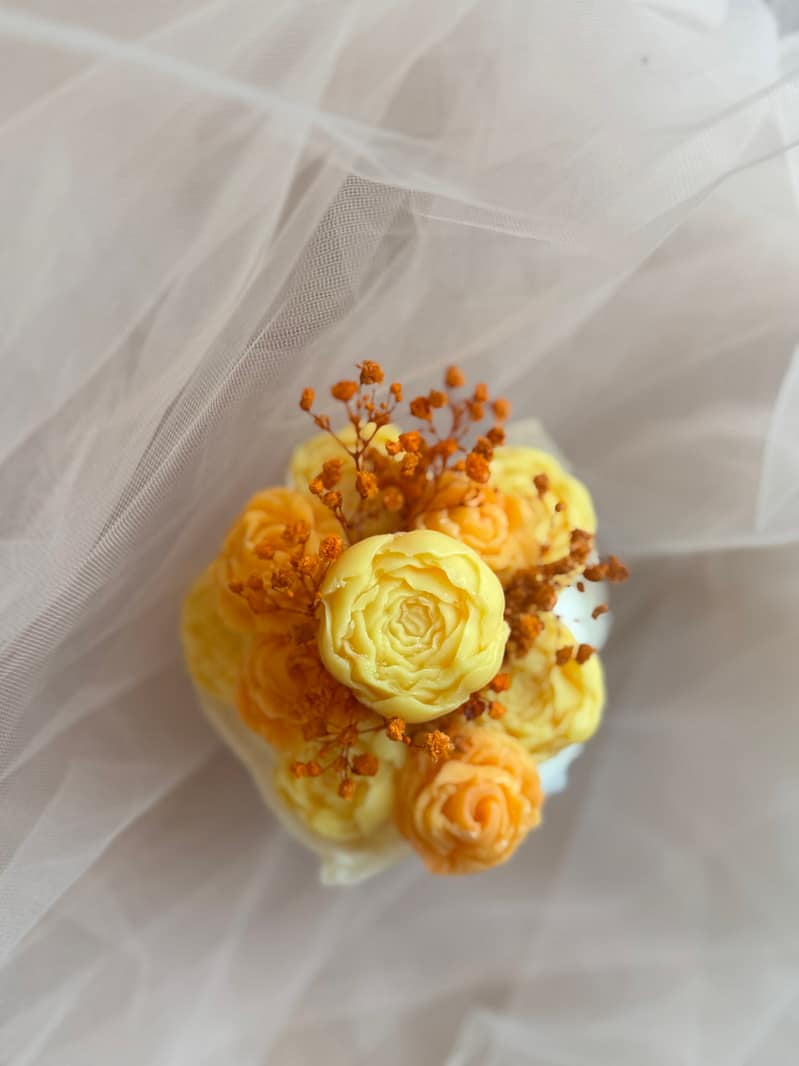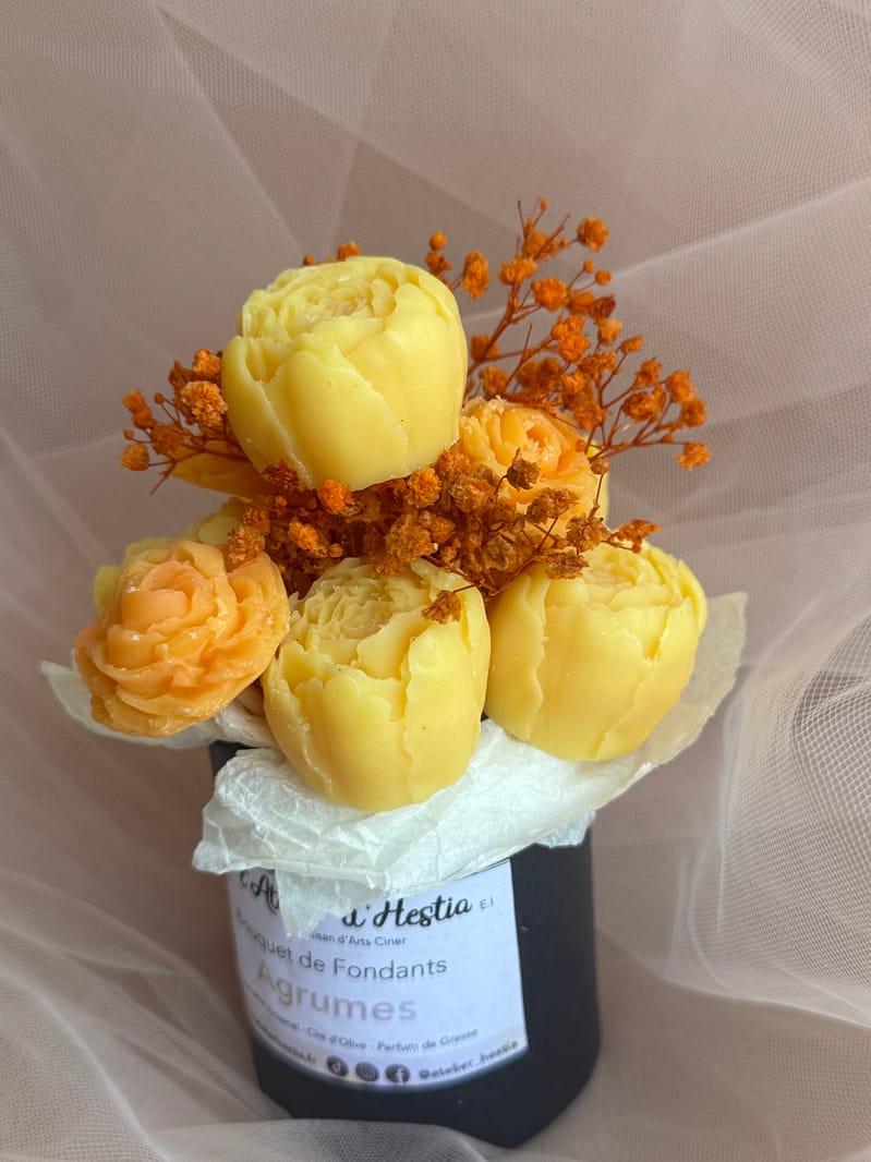 Chez L’Atelier d’Hestia, chaque création est pensée pour allier esthétique, parfum et émotion. La composition florale de fondants Agrumes incarne cette philosophie : une création fraîche, lumineuse et élégante, conçue pour parfumer et embellir le quotidien.