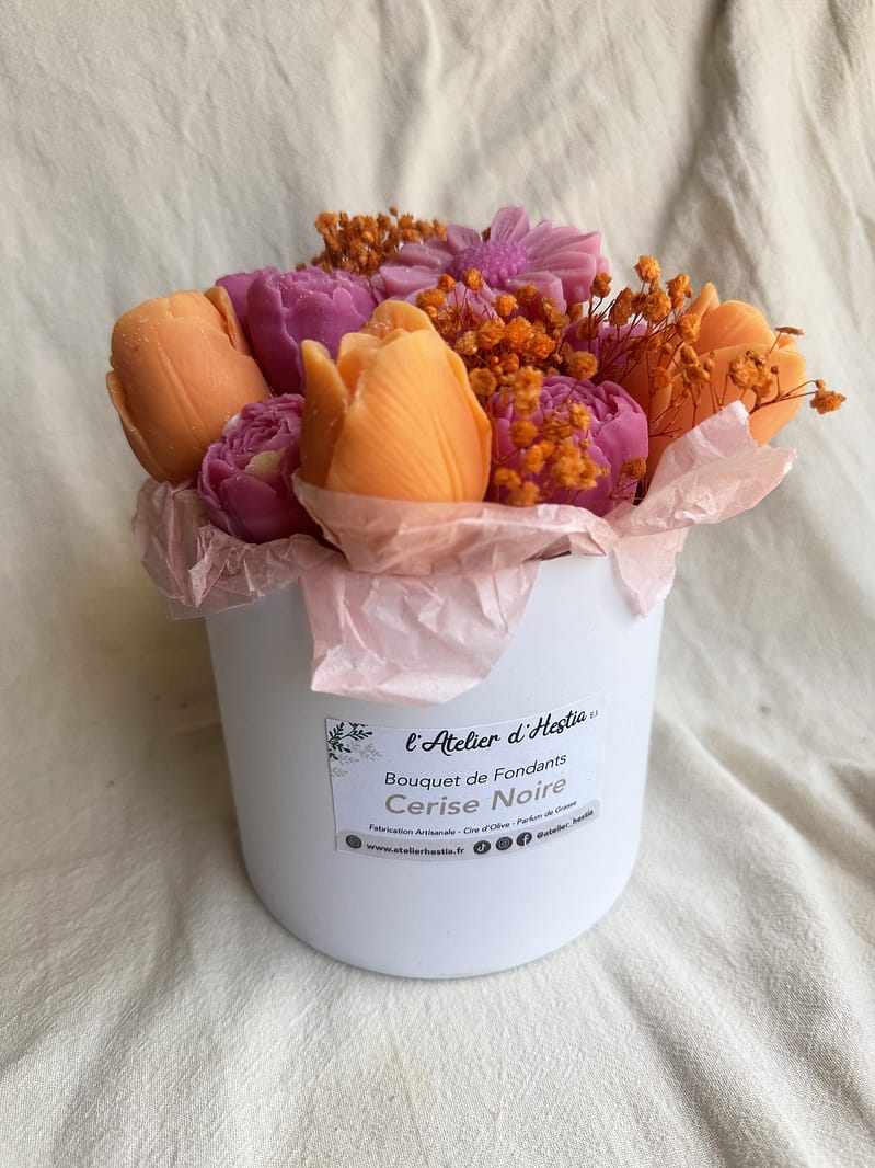 Chez L’Atelier d’Hestia, chaque création est pensée pour allier esthétique, émotion et plaisir olfactif. La composition florale de fondants Cerise Noire incarne parfaitement cette vision : une création intense, gourmande et élégante, conçue pour parfumer et embellir votre intérieur.