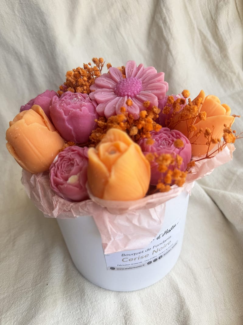 La composition florale de fondants Cerise Noire est une création artisanale décorative et parfumée, pensée pour celles et ceux qui recherchent une ambiance à la fois gourmande, intense et raffinée. Plus profonde et plus sensuelle que la cerise classique, la cerise noire dévoile un parfum riche, fruité et légèrement sucré, idéal pour créer une atmosphère élégante et enveloppante.