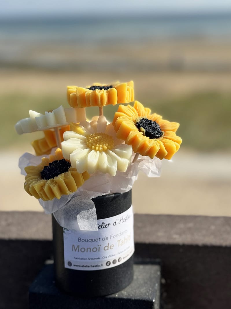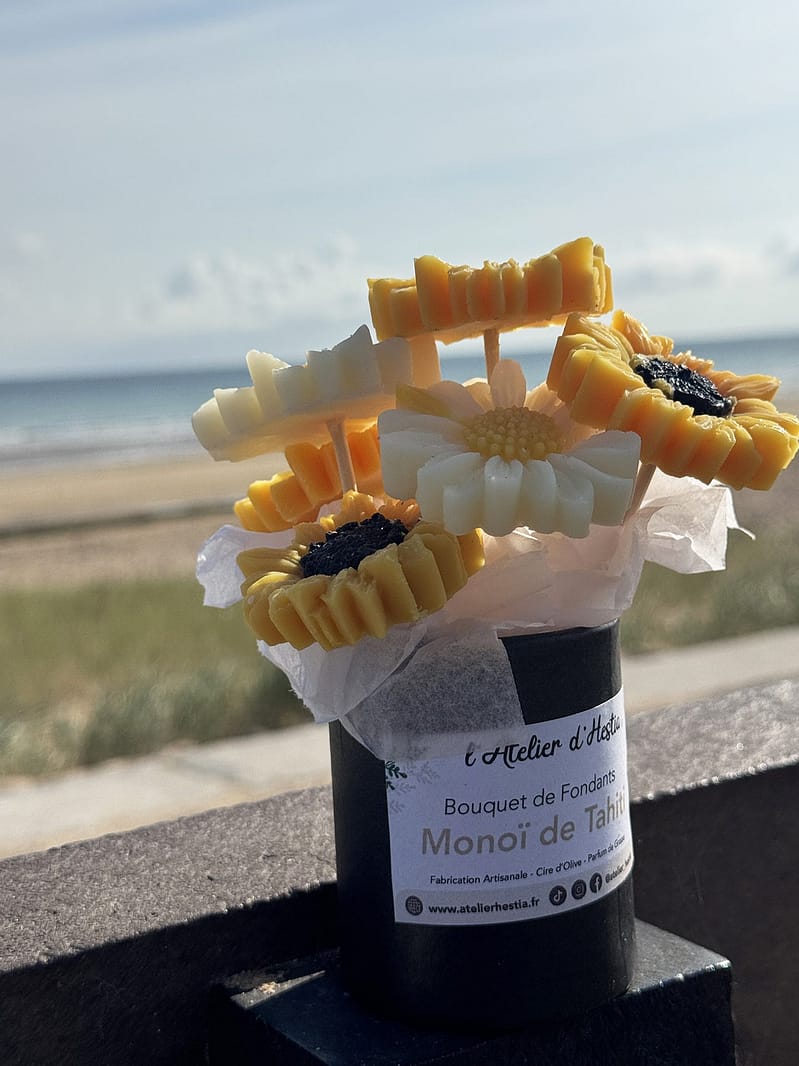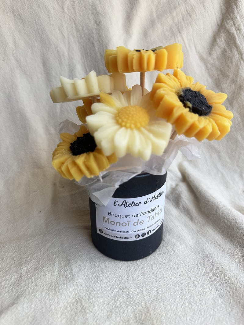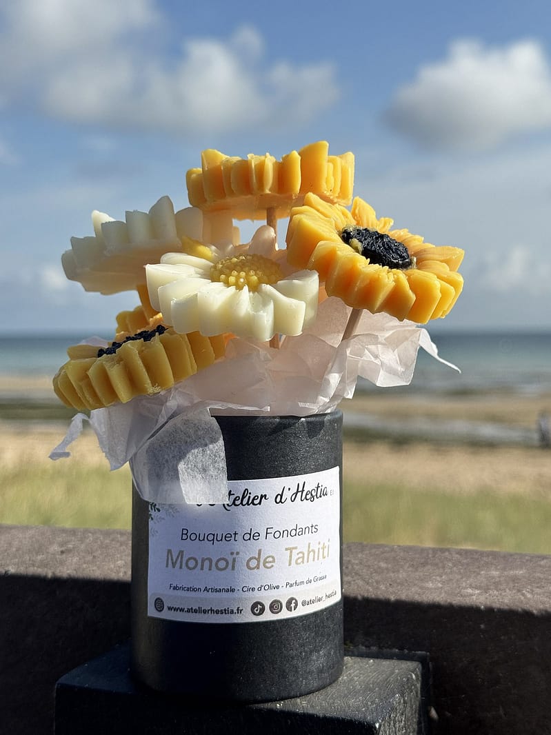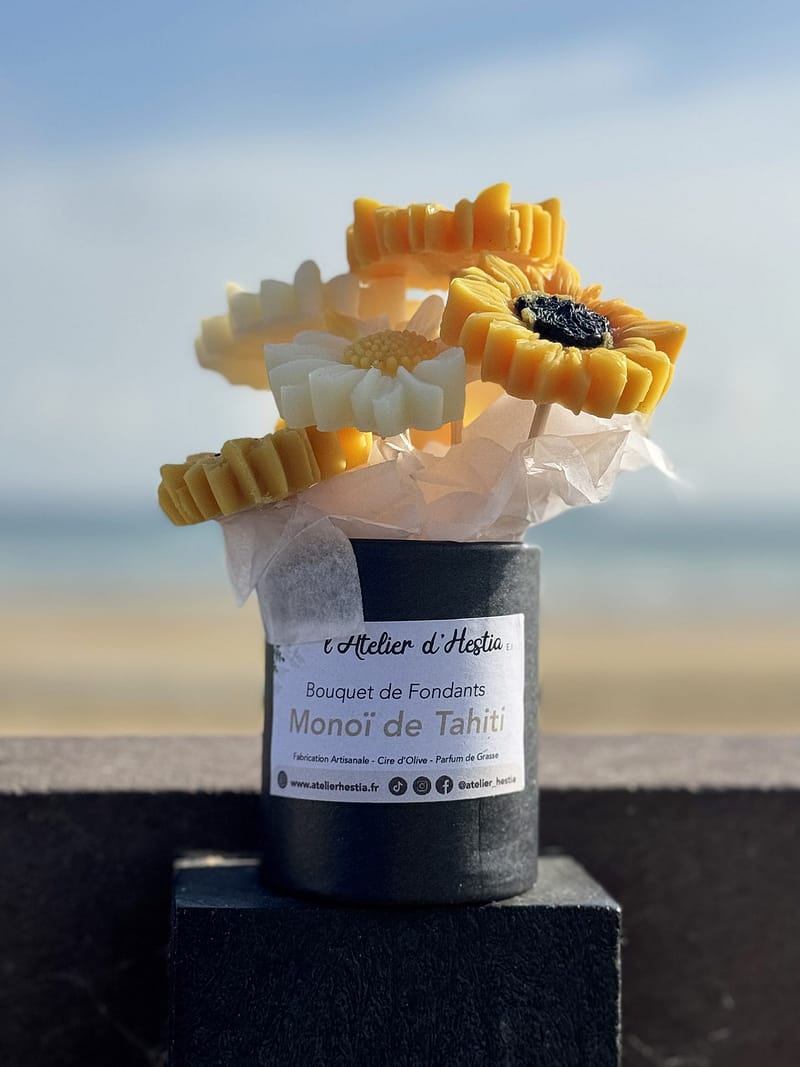 Chez L’Atelier d’Hestia, chaque création est pensée pour faire voyager les sens et sublimer le quotidien. La composition florale de fondants Monoï de Tahiti incarne parfaitement cette vision : une création solaire, élégante et sensorielle, conçue pour parfumer et embellir votre intérieur.