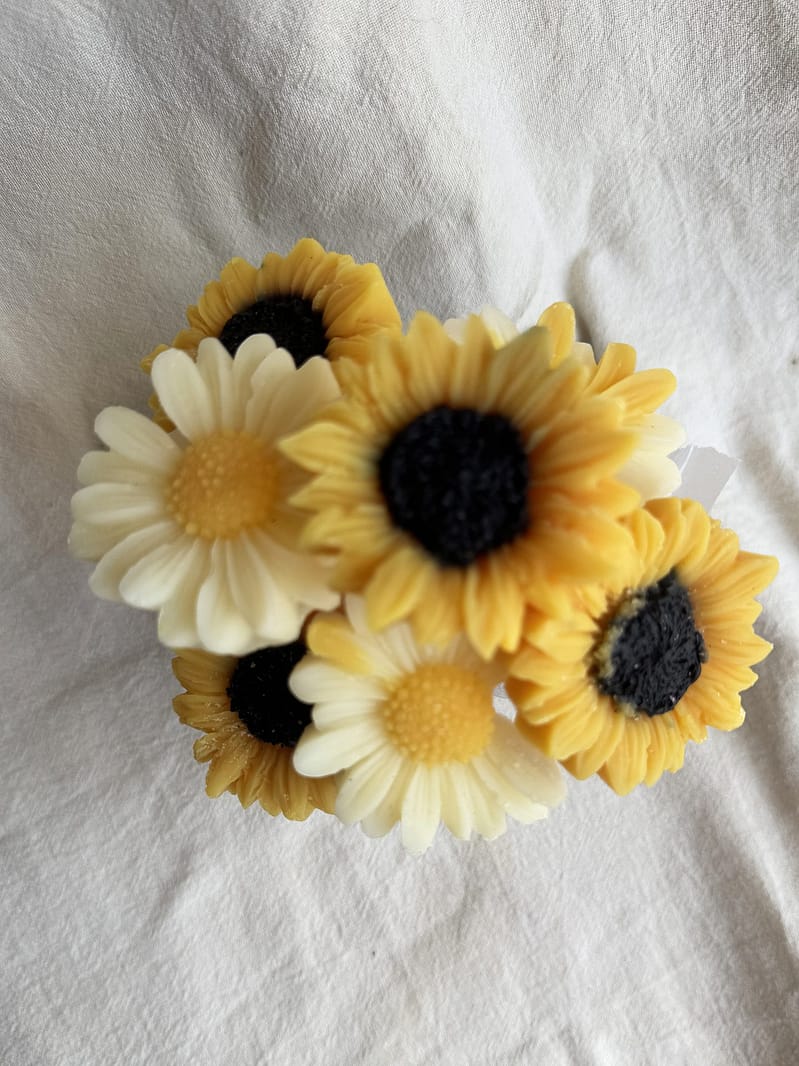 Chaque composition florale est entièrement réalisée à la main. Les fondants sont moulés en formes florales ou décoratives, puis assemblés harmonieusement pour créer un ensemble visuel élégant et solaire.