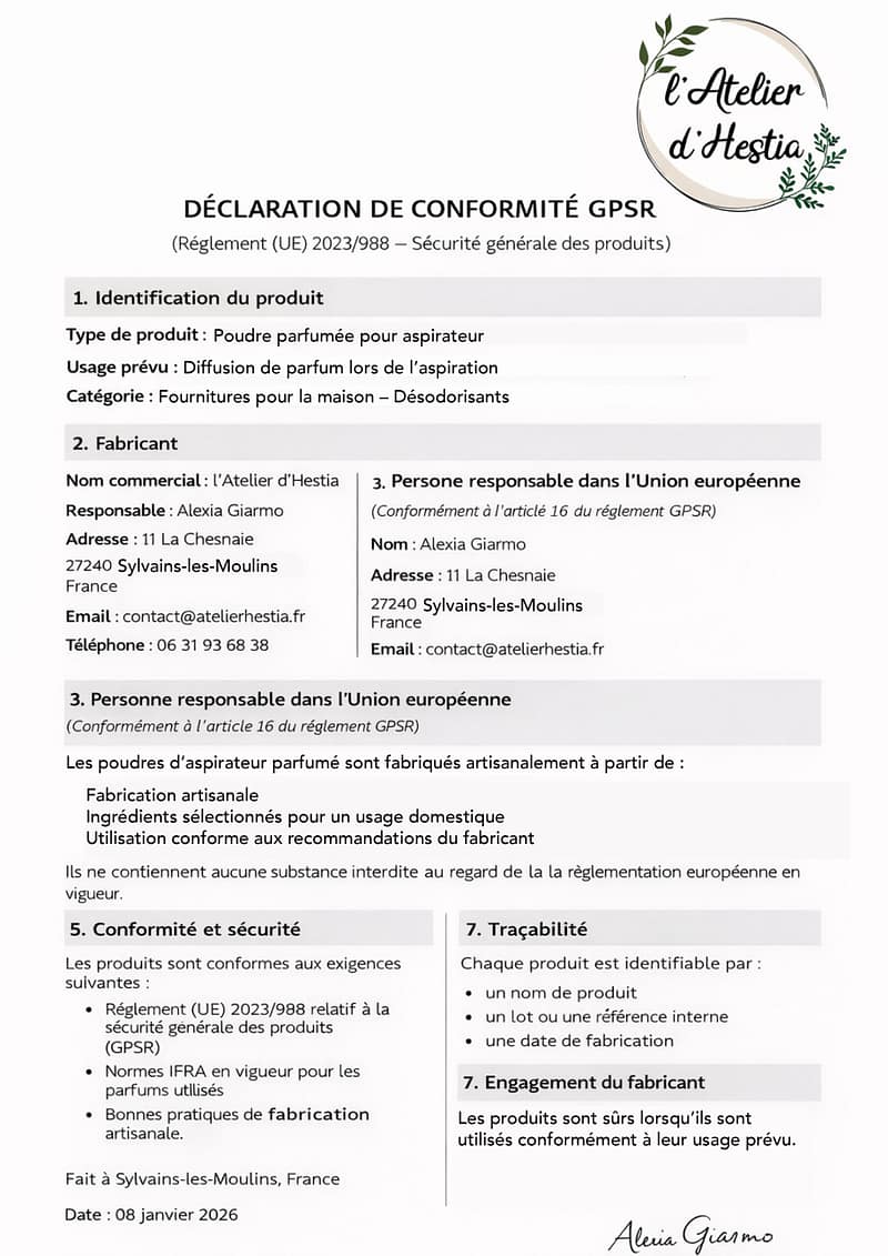 💡 Astuce : pour une diffusion plus intense, vous pouvez déposer la poudre directement dans le sac ou le bac de l’aspirateur (si compatible).